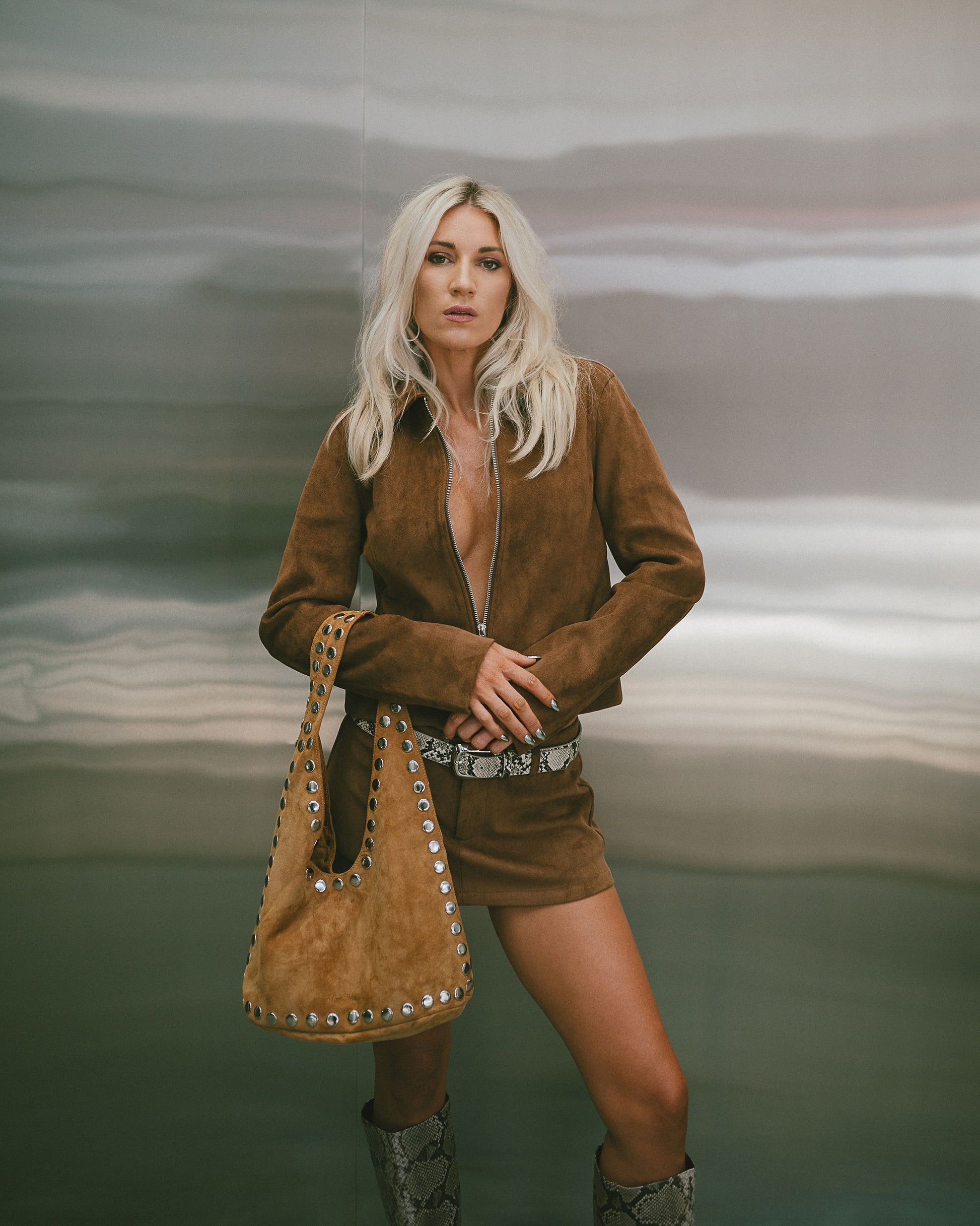 The Kate Studded Slouch Bag is your everyday statement effortlessly soft with just the right amount of edge. Made from rich tobacco suede, it features oversized silver eyelets hand-set along the seams, adding a bold, industrial contrast to its relaxed silhouette.